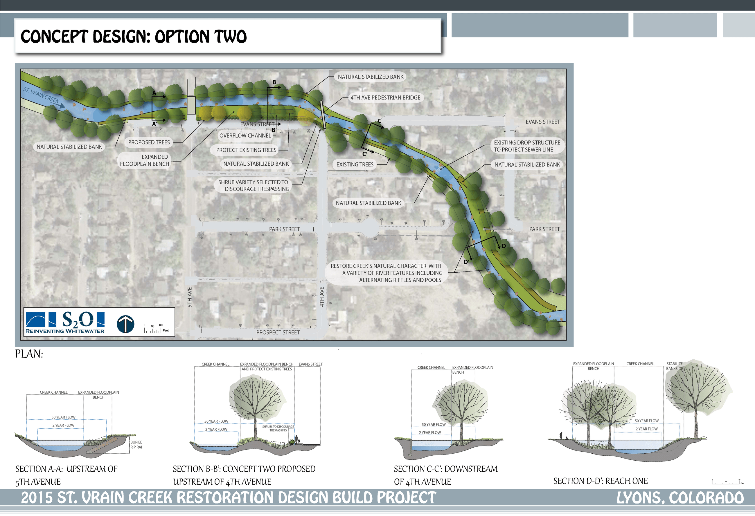 According to the Lyons Recovery Action Plan, the St. Vrain Creek restoration entails river way improvements including rock formations and re-vegetation, to reintroduce wetlands, slow the flow of the river, and create natural areas for fish and plants to thrive and support recreational use of the river. The project will also reestablish pedestrian paths and access points for river users. As part of the grant conditions, the project must be complete by the end of March 2016.