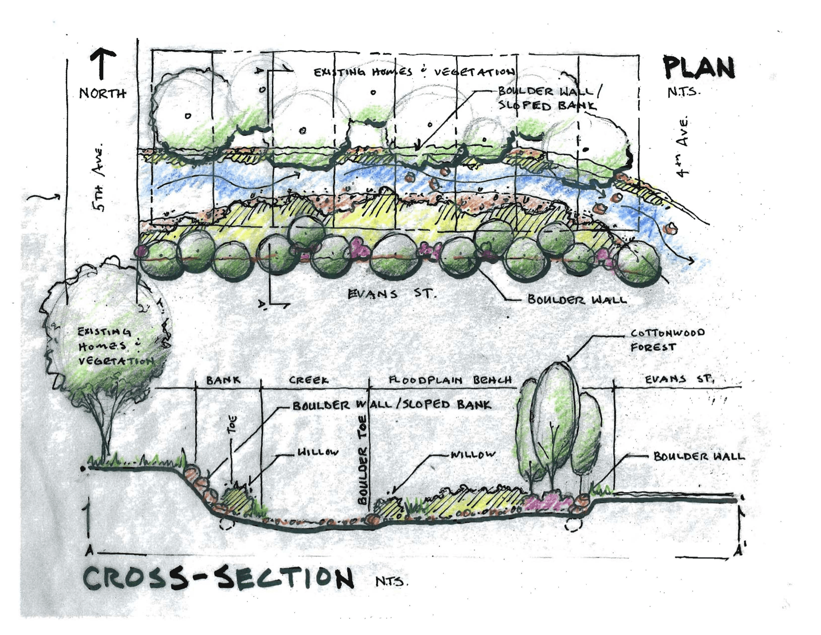 To offset the removal of existing trees, this project will also re-vegetate all graded and barren areas with a diversity of native riparian species that will help to increase the resiliency and stability of the channel and floodplain.